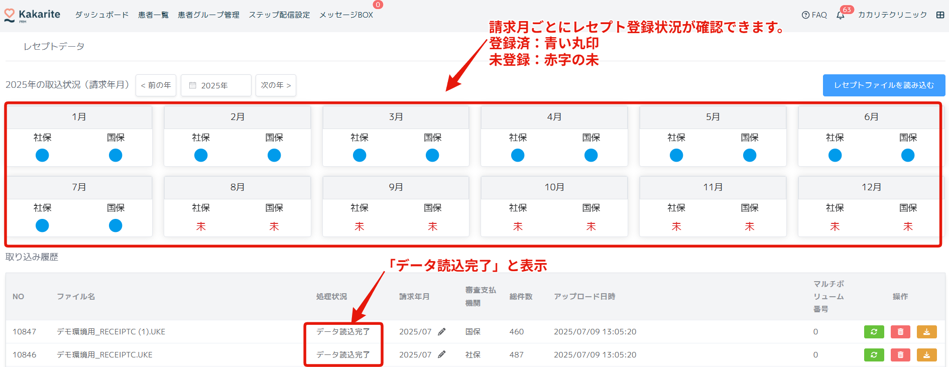 ご登録いただいたデータの登録状況はレセプトデータ登録画面から確認できます。