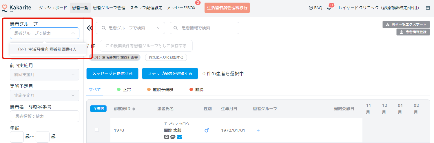 次回作成が必要な時期で該当患者の一覧を抽出表示することができるので、患者に対し次回受診時に記入してきて頂くよう、依頼メッセージの配信を行う際にご利用頂けます。