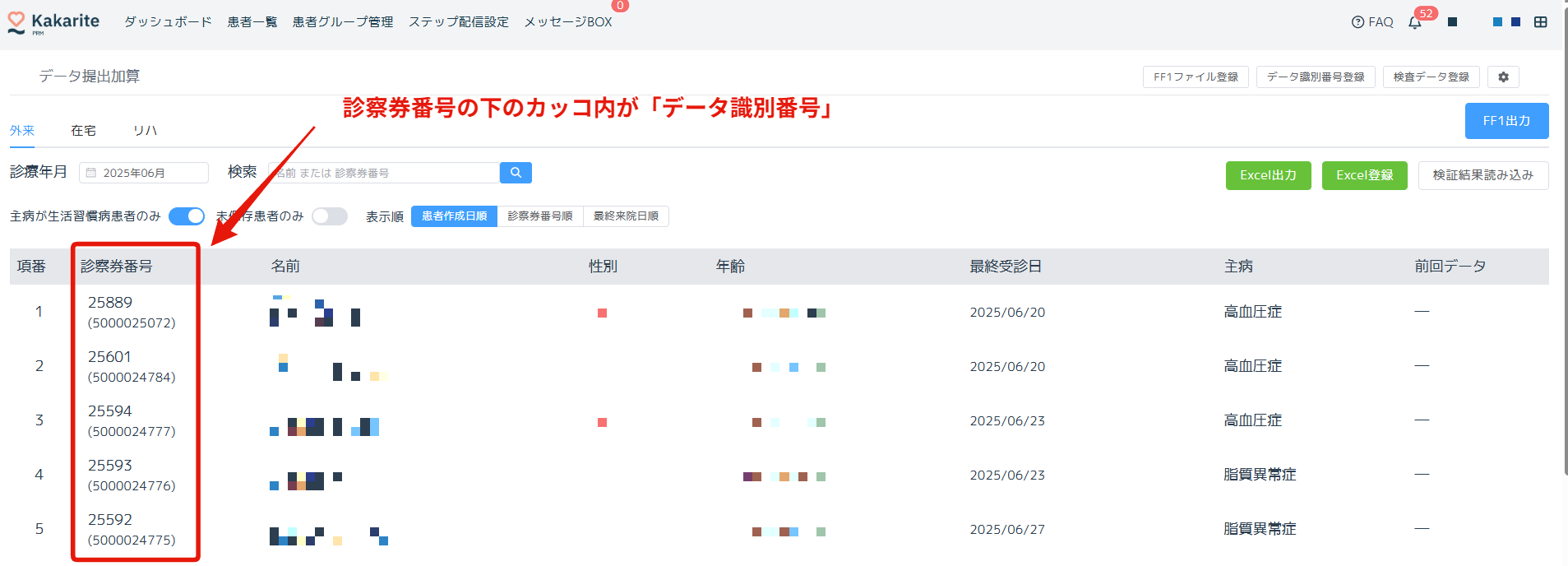 正常にCSVデータが取り込まれている場合は、下記のように診察券番号の下にデータ識別番号が表示されます。