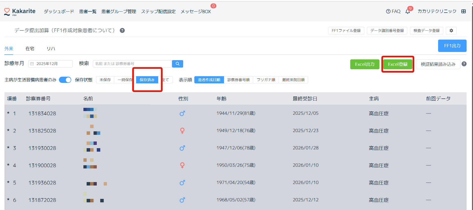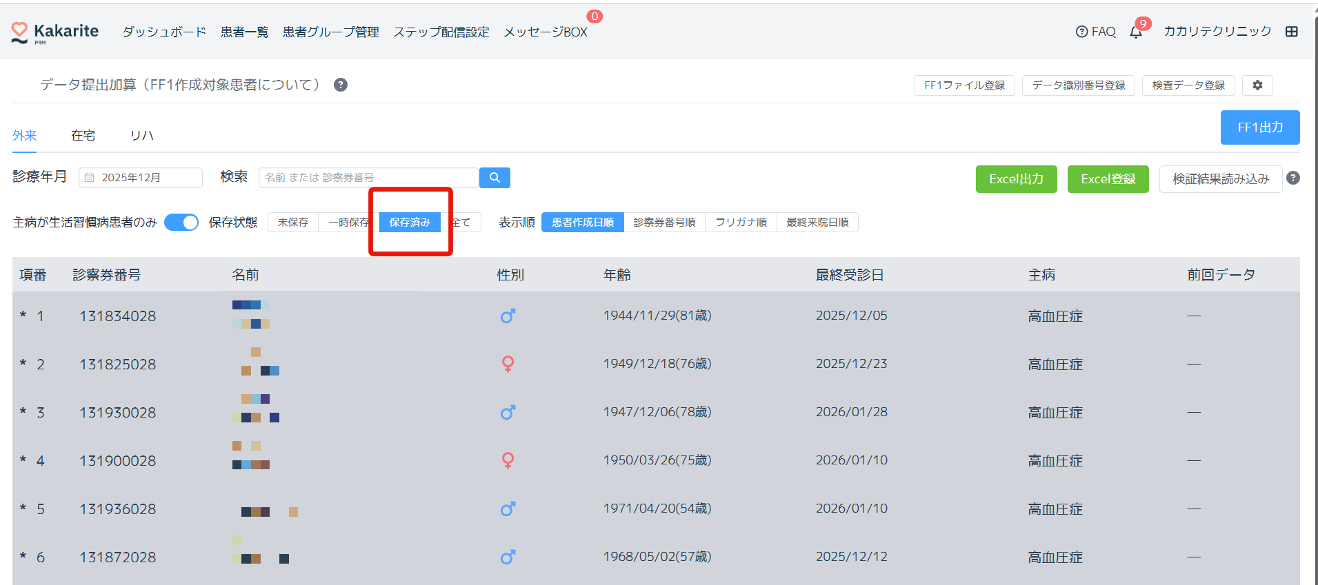 正常に登録完了すると、当該診療年月のFF1が一括保存されます。「保存済み」を押すと保存済の患者が表示されます。