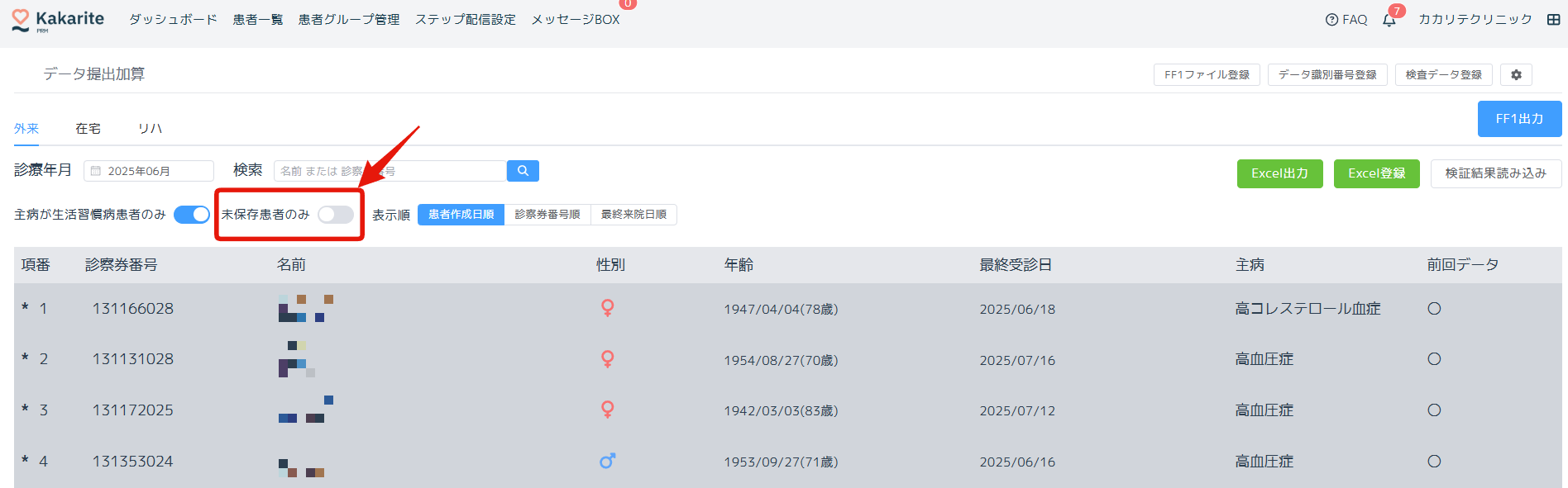「Excel登録」ボタンよりインポートいただくと、記載した内容が反映され、自動で保存状態になります。FF1保存済の患者は画面上でデフォルトでは非表示となり、「未保存患者のみ」のスイッチをオフにすると表示される形となります。