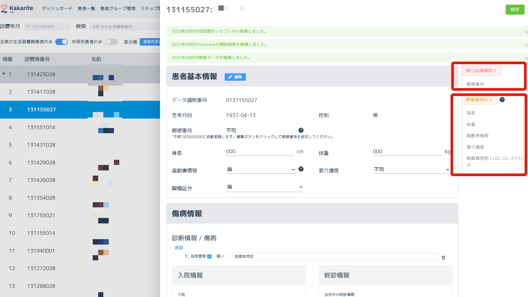 カカリテにあるレセプトデータや、問診のデータを元に必要項目を一定程度補足します。