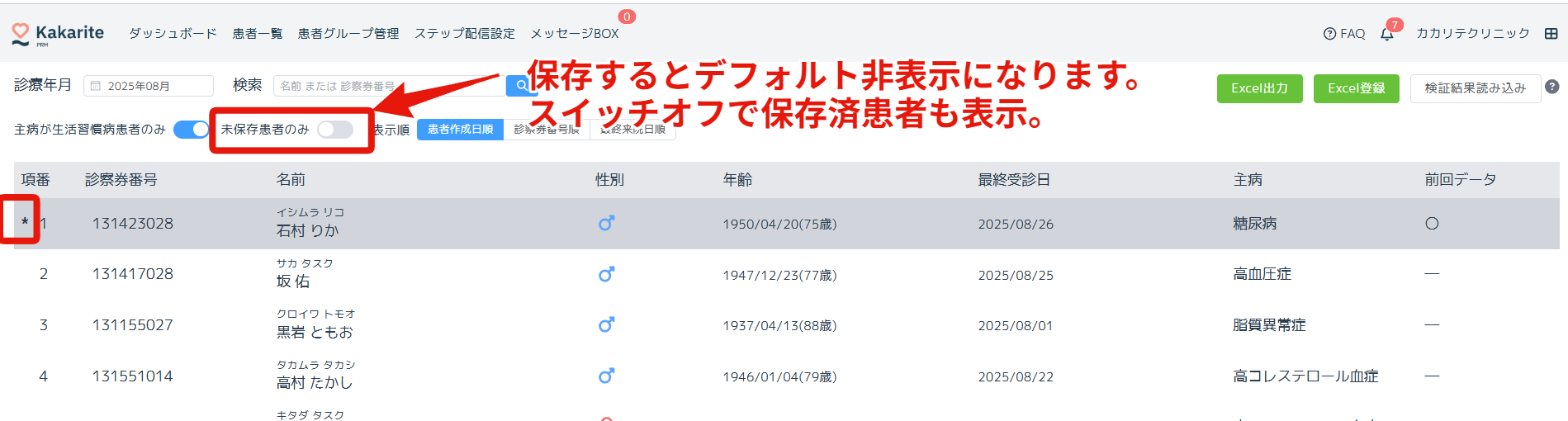 保存されると項番の横に「*」がつき、保存済の患者は一覧から非表示になります。保存済の患者を表示する場合は、画面左上部にある「未保存患者のみ」スイッチをオフにしてください。