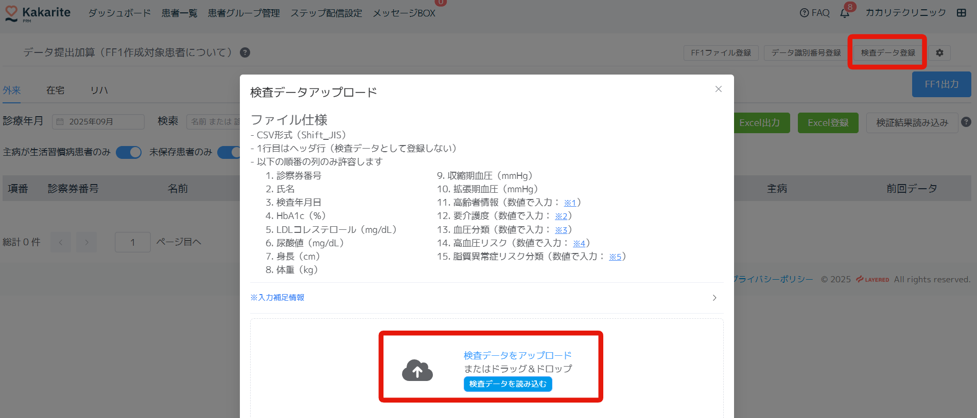 検査会社等から検査データ(HbA1c/LDLコレステロール/尿酸値)をCSVファイルで提供頂ける場合は、そのCSVファイルをカカリテに取り込むことでFF1に検査データを一括登録することができます。下記の通り「検査データ登録」をクリックし、立ち上がった「検査データアップロード画面」からCSVファイルをアップロードしてください。