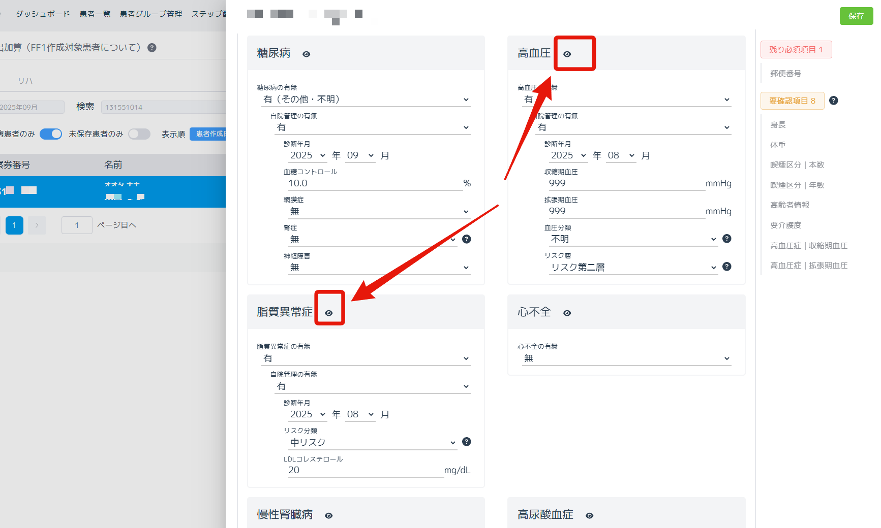 - FF1保存済の患者のHbA1c/LDLコレステロール/尿酸値が「不明」の場合