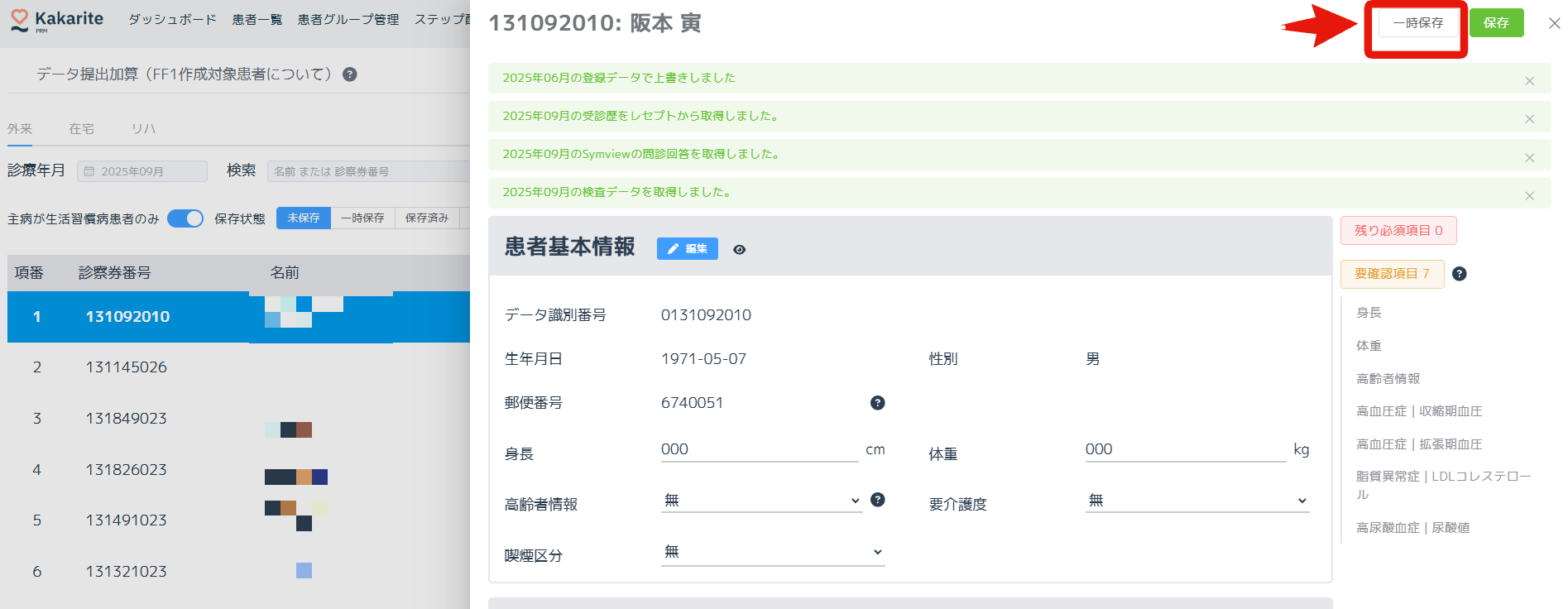 後で追加入力が必要な患者は「一時保存」、全項目の入力が完了している患者は「保存」として使い分けて頂くと便利です。尚、「FF1出力」すると「保存済み」状態の患者のみ出力され、「一時保存」状態の患者は出力されません。