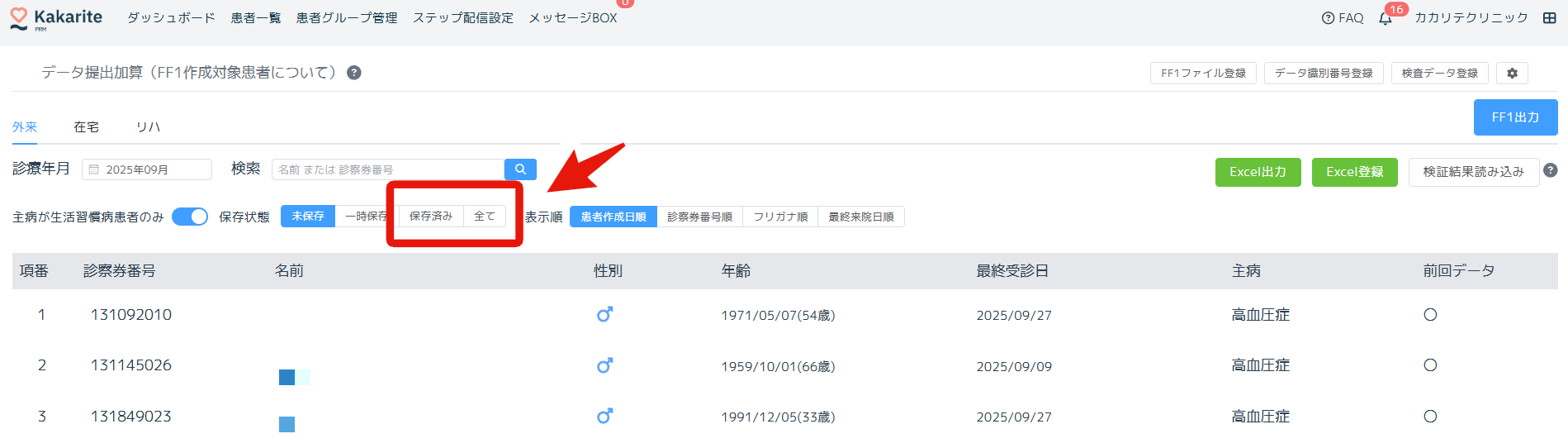 正常に登録完了すると、当該診療年月のFF1が一括保存されます。「未保存患者のみ」スイッチを押すと保存済の患者が表示されます。