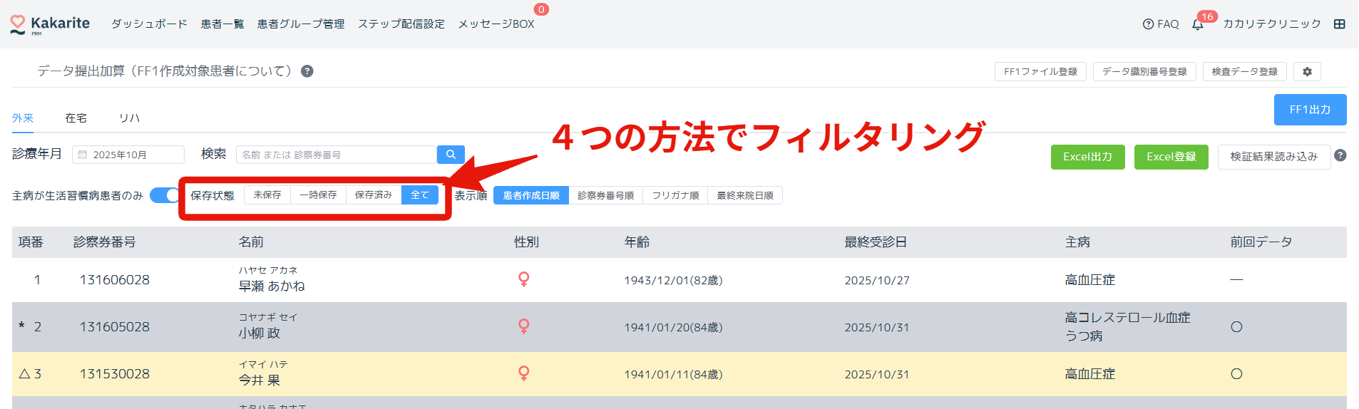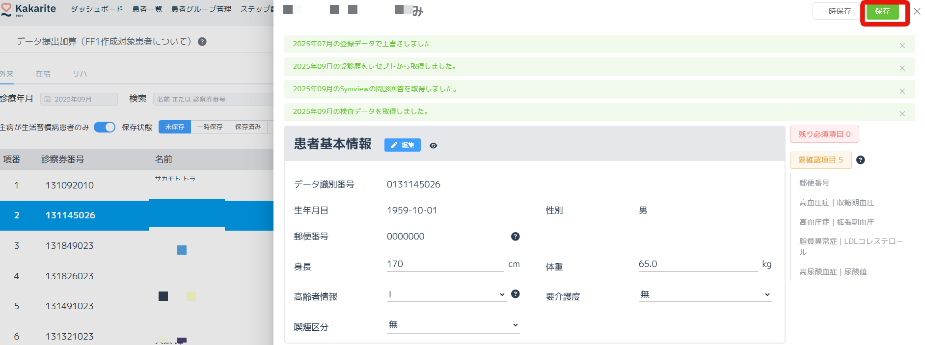 一覧に表示されていても保存をしていない患者についてはFF1ファイルに掲載されません。必ずすべての患者の入力・保存ボタンの押下をお願いします。